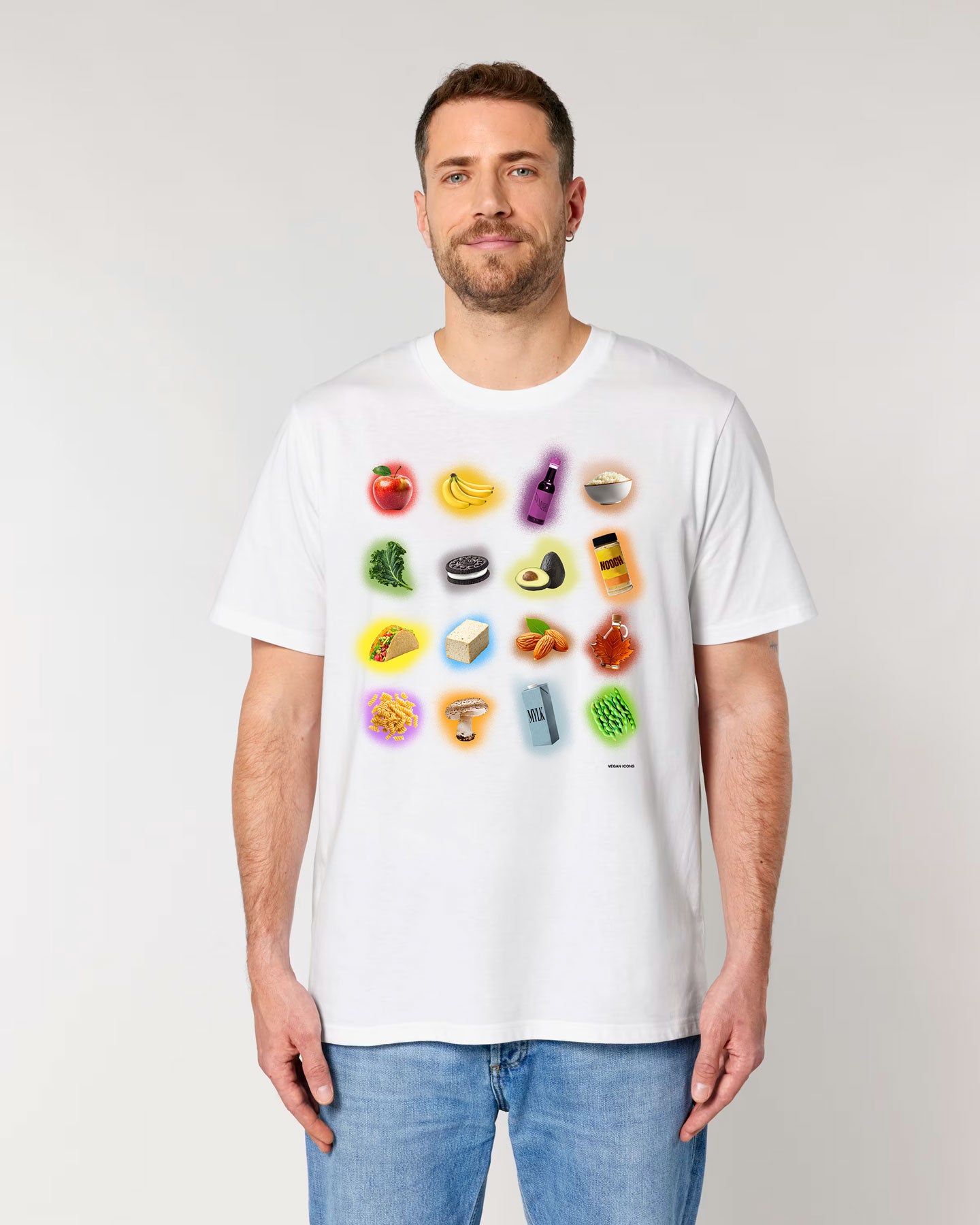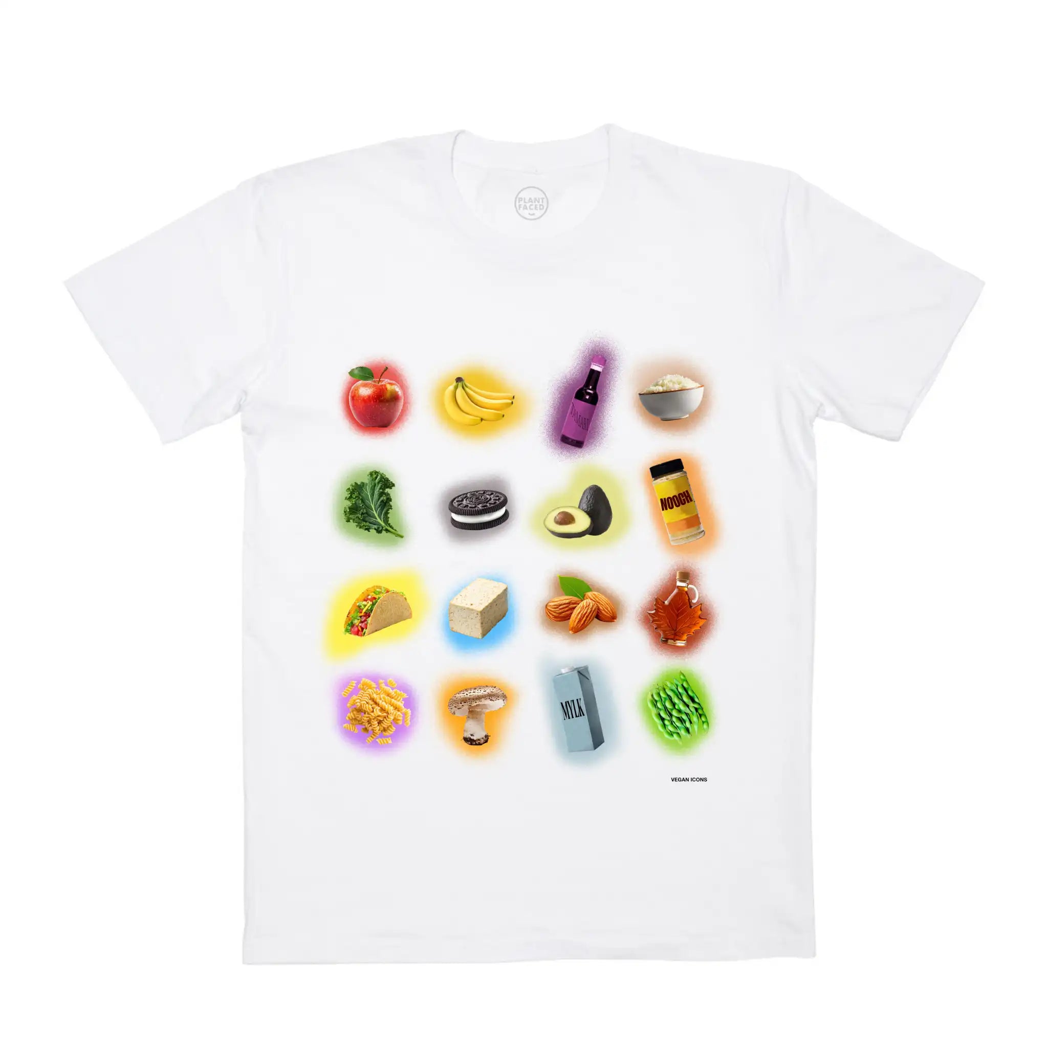 The Vegan Icons design reimagines plant-based staples as cultural artefacts - rendered in bright pop colours, suspended like gallery pieces. Oat milk, tofu, maple syrup, tamari, nooch, and the rest of the plant-powered hall of fame. Ordinary objects. Personal symbols.